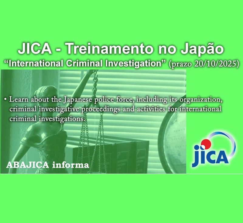 A JICA informa que as inscrições estão abertas para o curso de treinamento no Japão: “International Criminal Investigation“ Learn about the Japanese police force, including its organization, criminal investigative proceedings and activities for international criminal investigations. Saiba mais AQUI Fonte: abajica.org/2025/treinamento-no-japao-jica-international-criminal-investigation-3