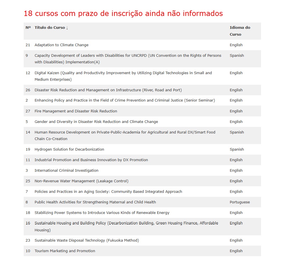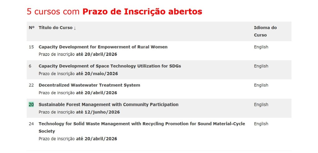 • Cursos JICA Ano Fiscal 2026: São oferecidos 29 cursos. Os cursos estão listados por ordem alfabética do título